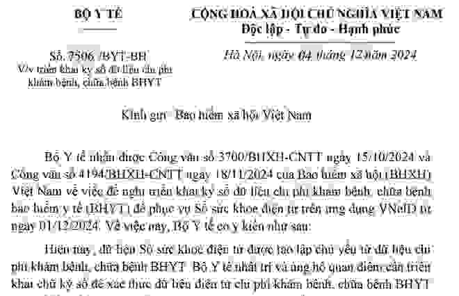 Công văn số 7506/BYT-BH ngày 04/12/2024 của Bộ Y tế gửi BHXH Việt Nam về việc triển khai ký số dữ liệu chi phí khám bệnh, chữa bệnh