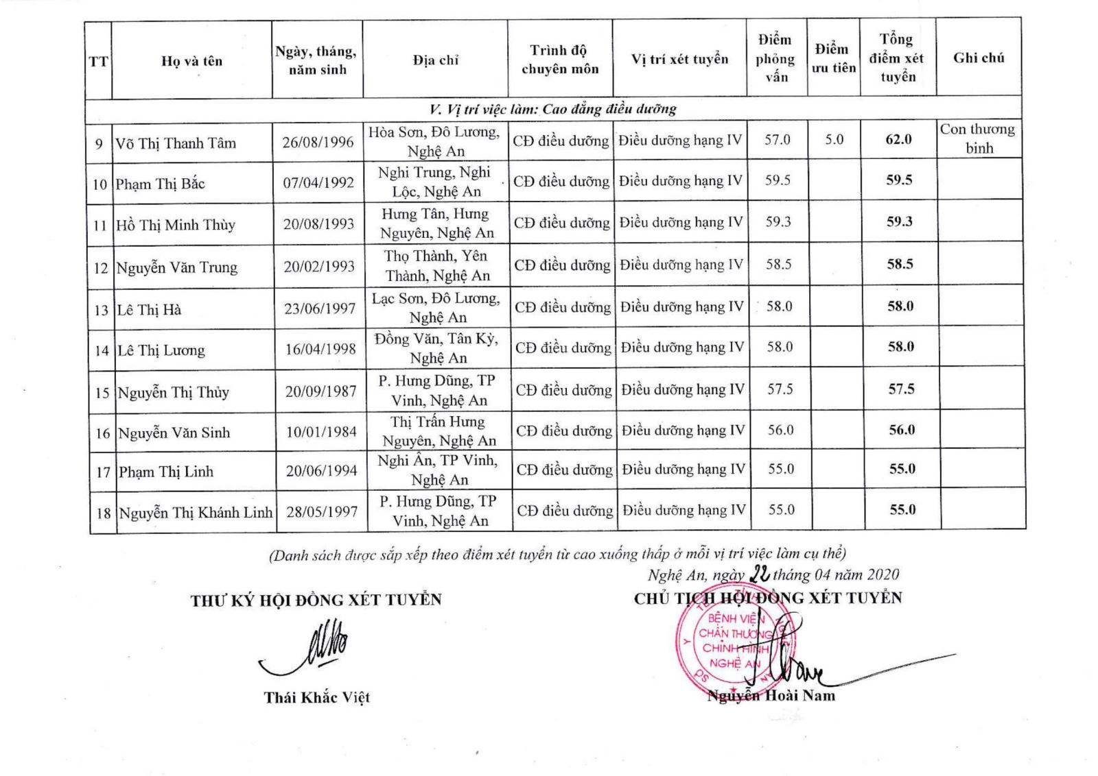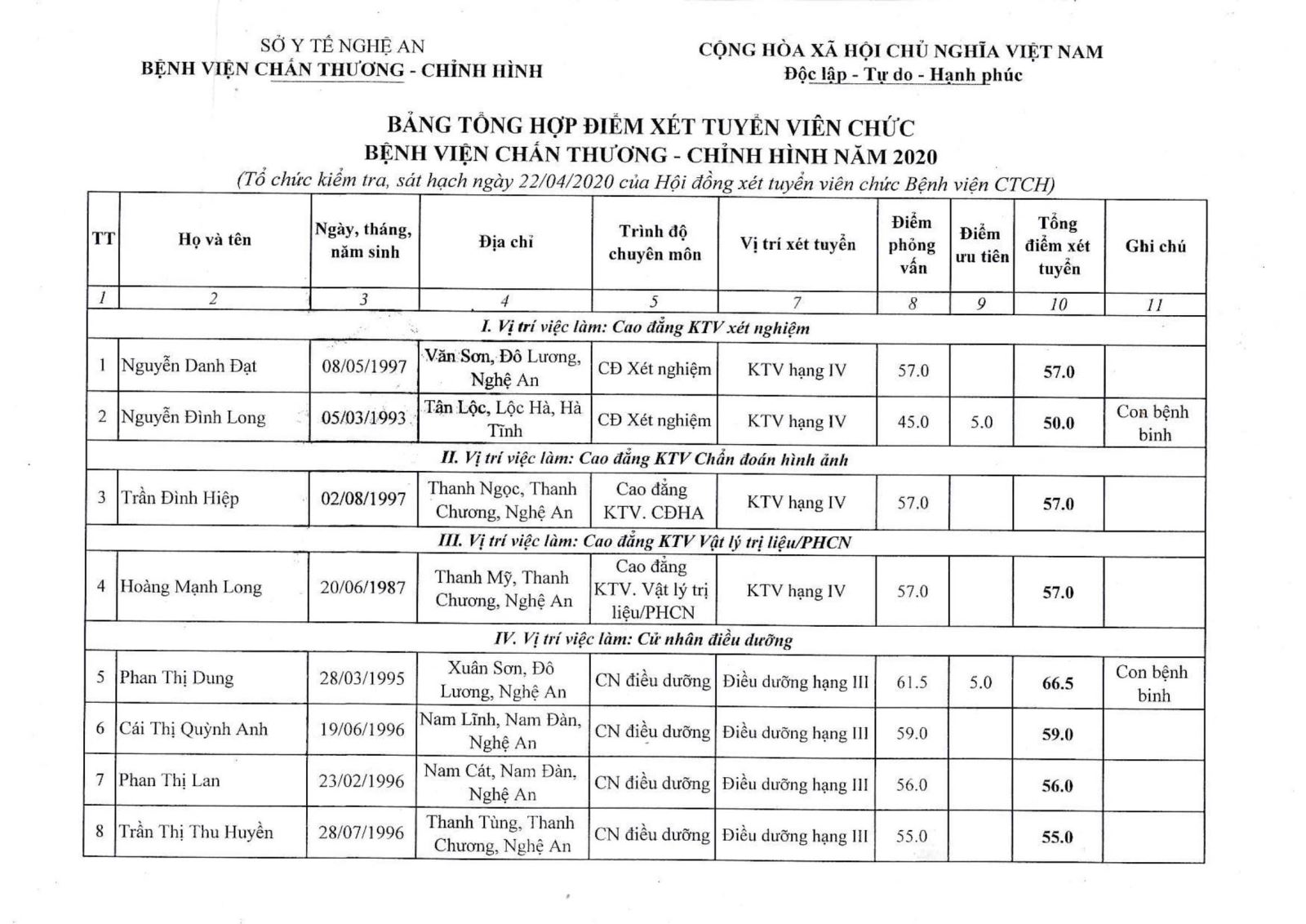 Bệnh viện Chấn thương Chỉnh hình Nghệ An xin thông báo bảng kết quả điểm xét tuyển viên chức ngày 22/04/2020: