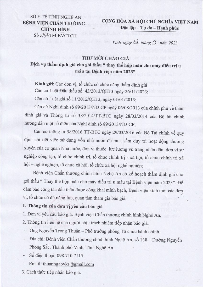 Bệnh viện Chấn thương - Chỉnh hình Nghệ An thông báo mời chào giá dịch vụ thẩm định giá cho gói thầu "thay thế hộp màu cho máy điều trị u máu tại Bệnh viện năm 2023" như sau: